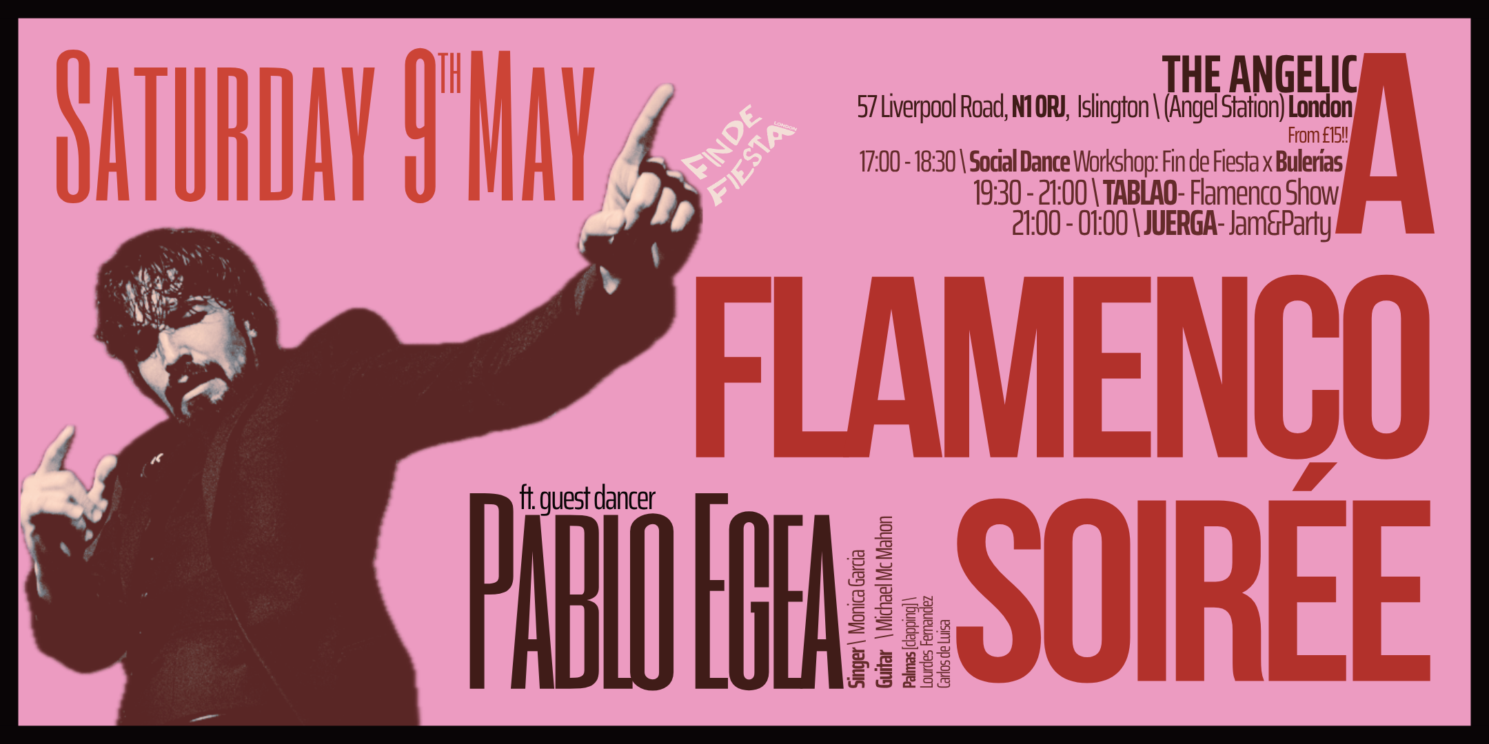 A Flamenco Soirée organised by Fin de Fiesta consisting of a dance class, flamenco show and juerga in any preferred combination! Topping the bill is dancer Pablo Egea coming direct from Spain. He’s joined by local powerhouses, vocalist Monica Garcia and accompanied by guitarist Michael McMahon and palmeros Lourdes Fernandez and Carlos de Luisa.